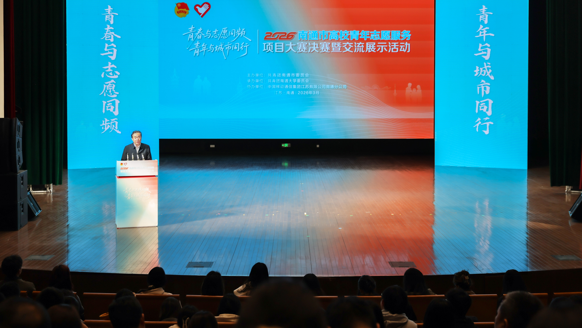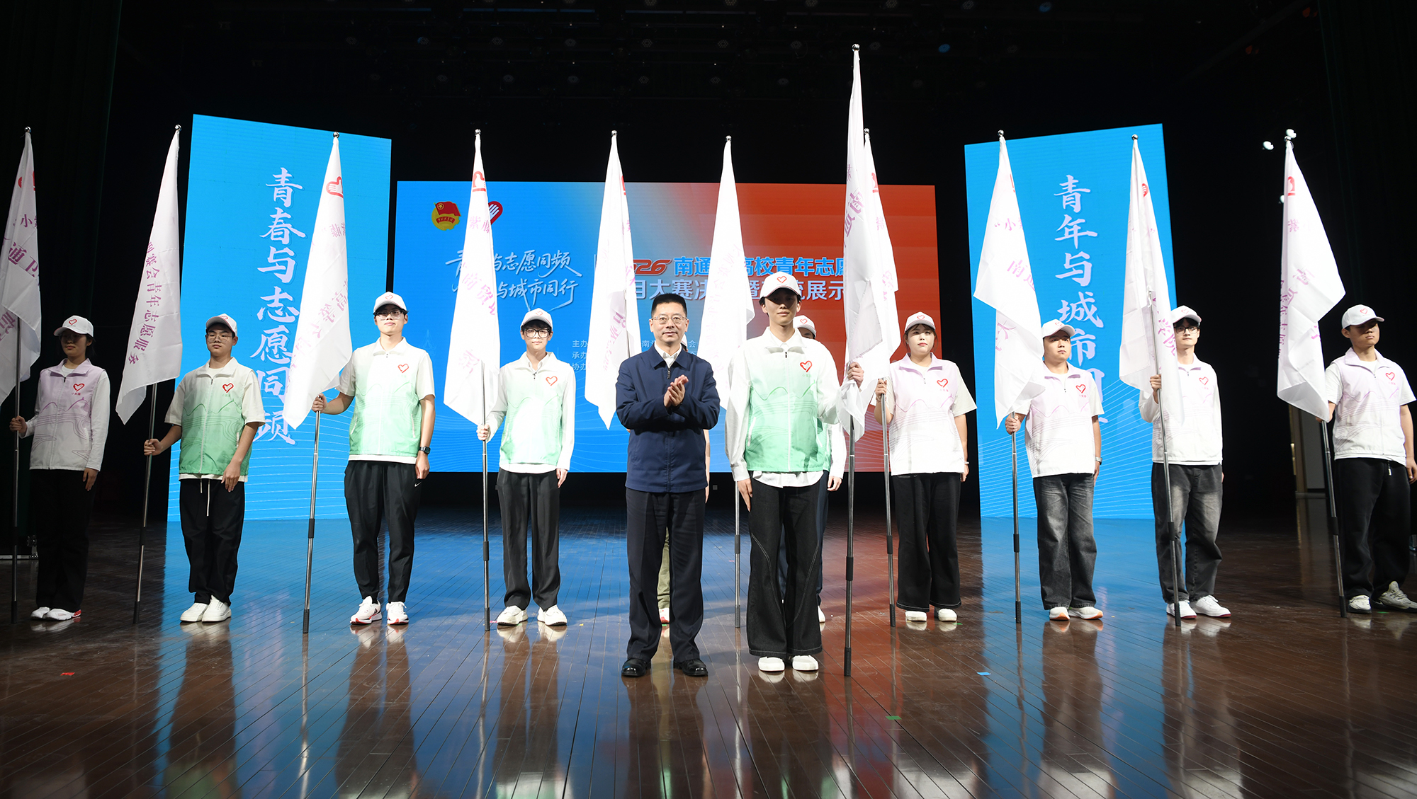 3月26日,2026南通市高校青年志愿服务项目大赛决赛暨项目交流展示活动在beat365官网啬园校区举行。现场发布关于大学生参与“垃圾分类”志愿服务的倡议,并举办“小紫藤”苏超志愿者出征仪式。南通市委常委、组织部部长倪春青为“小紫藤”青年志愿服务队授总旗。校党委常委、副校长吉明明代表学校致辞。中国青年报社党委委员、编委兼共青团新闻中心主任黄勇,南通市慈善联合总会副会长顾晓明,南通团市委书记曹铖出席活动。