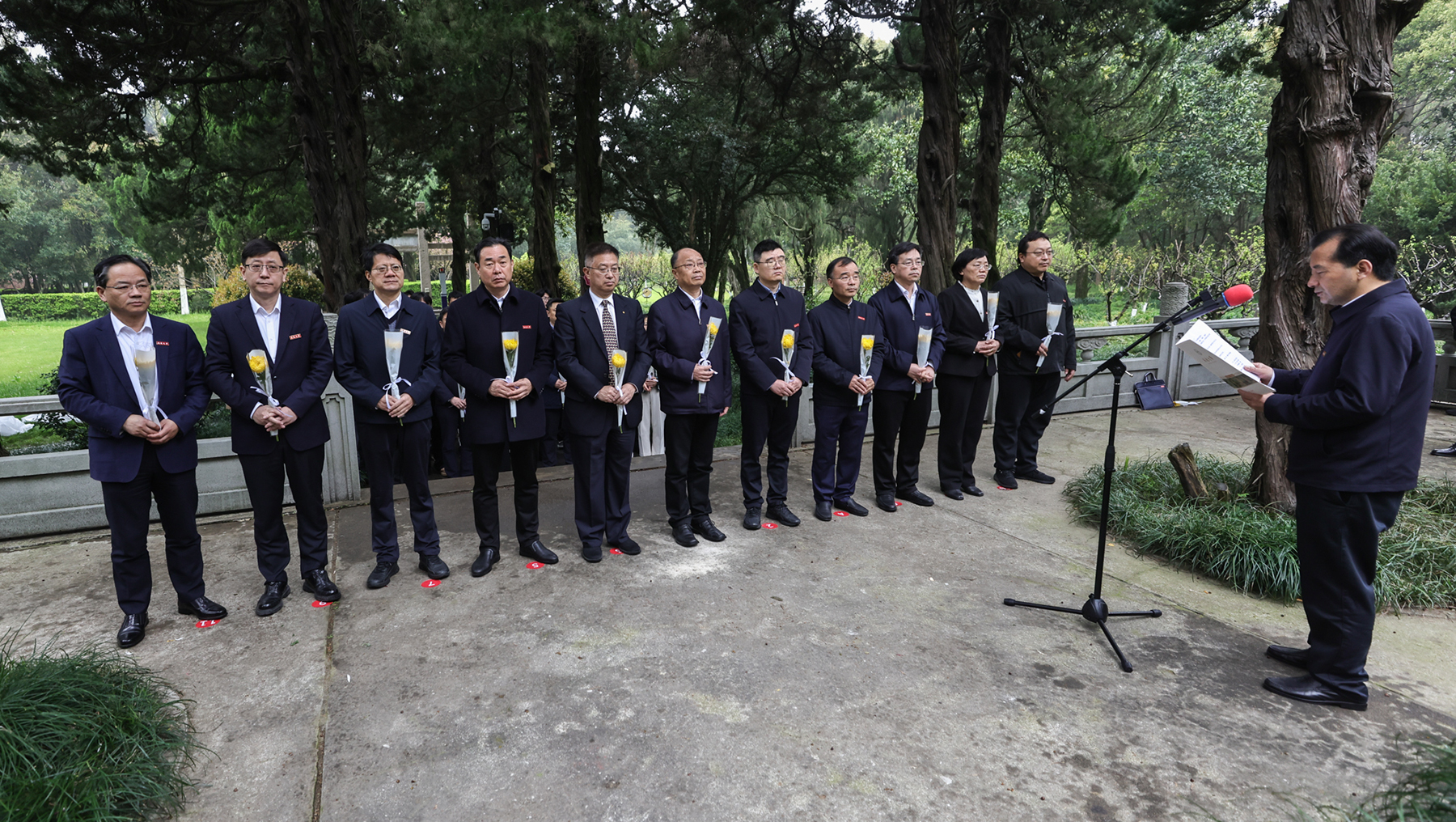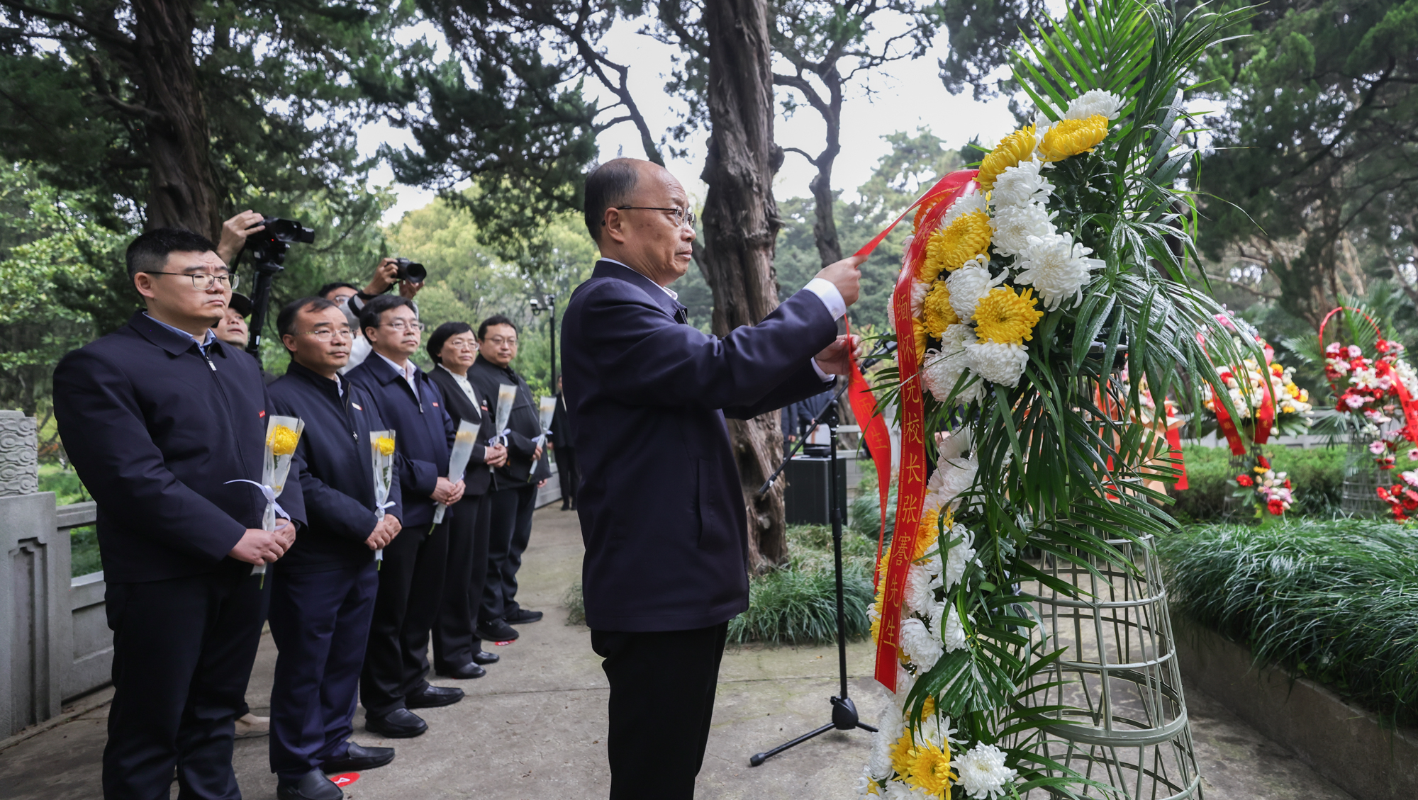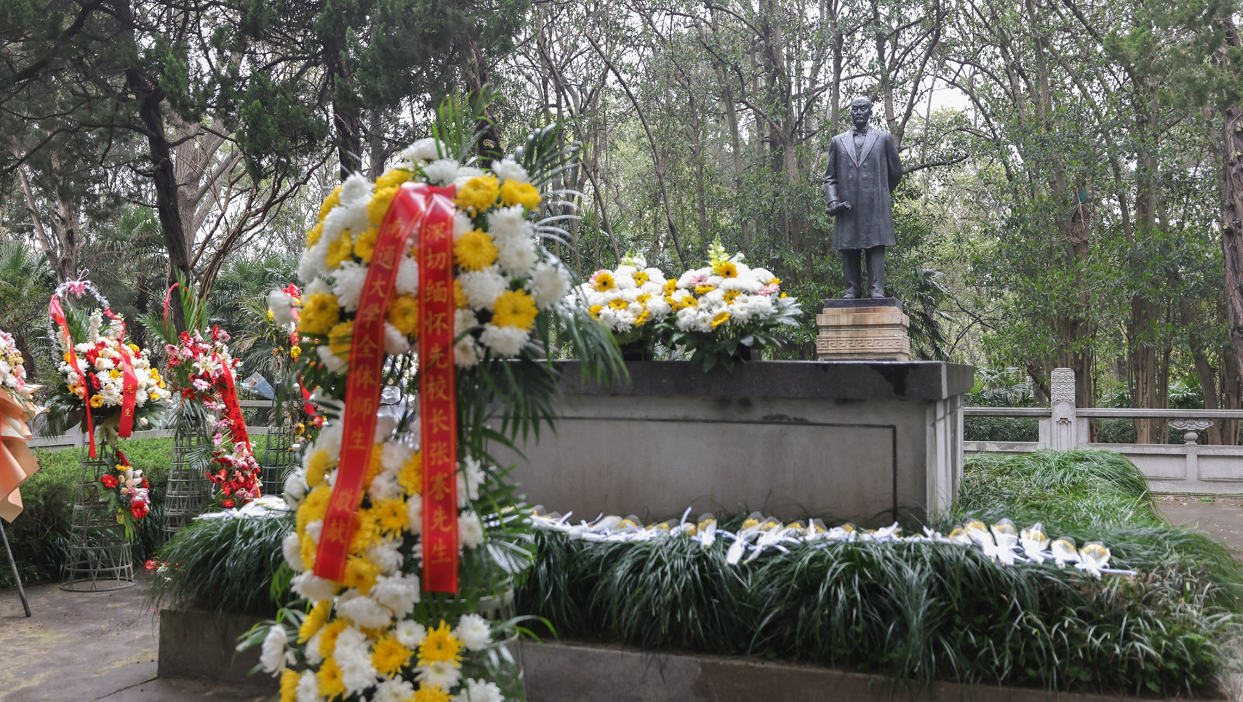 朵朵黄菊,寄托哀思。师生代表向张謇先生像三鞠躬,绕陵墓一周,表达对张謇先生的深切缅怀和崇高敬意。