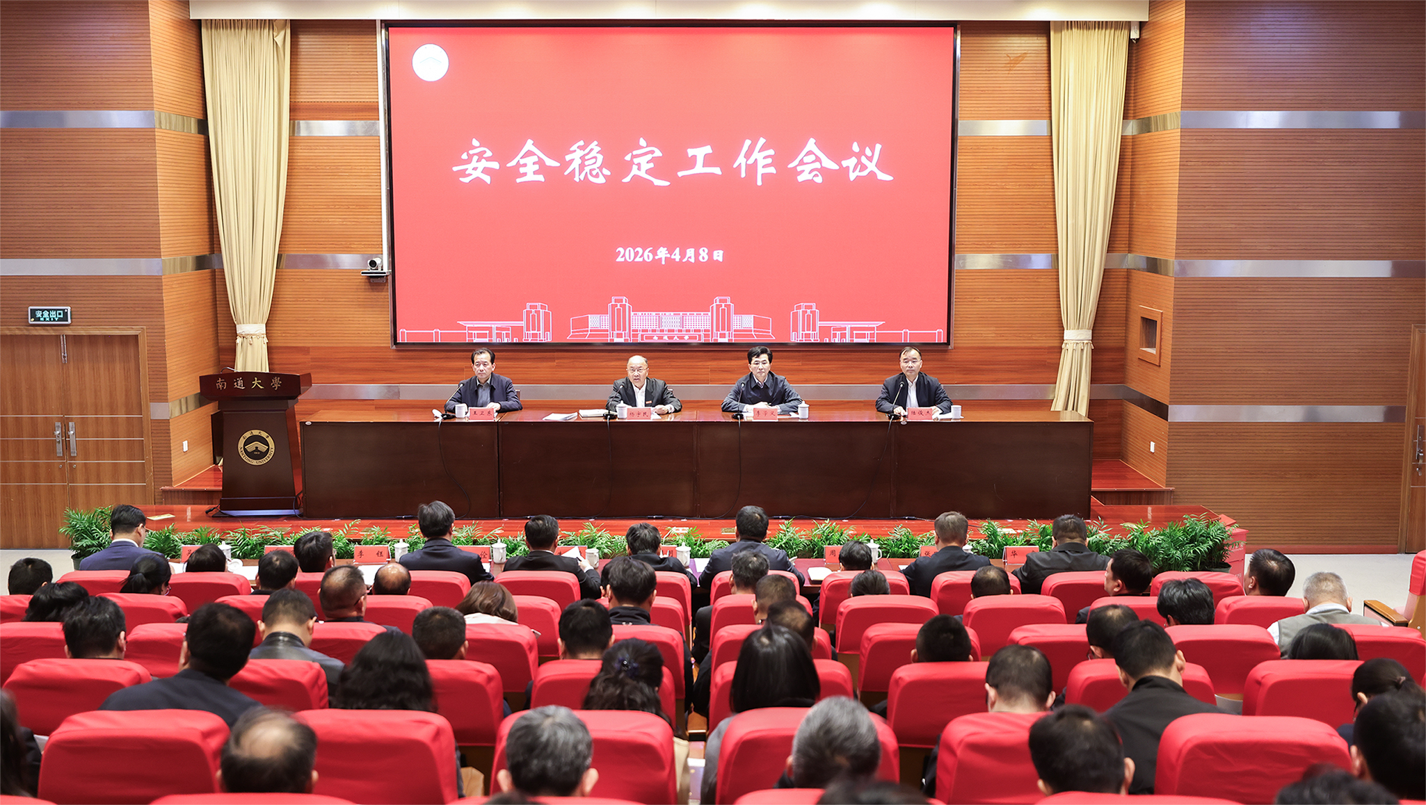 4月8日上午,beat365官网召开2026年上半年安全稳定工作会议。校党委书记杨宇民、南通市委政法委常务副书记李学义出席会议并讲话。校党委副书记王卫东通报学校安全稳定工作情况。校党委常委、副校长陆俊杰主持会议。南通市委政法委副书记朱正俊及全体在通校领导、党委常委出席会议。