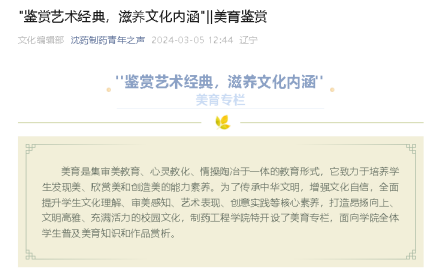 美育是集审美教育、心灵教化、情操陶冶于一体的教育形式,它致力于培养学生发现美、欣赏美和创造美的能力,全面提升学生文化理解、审美感知、艺术表现、创意实践等核心素养。BV伟德官方网站将美育教育与文化建设相结合,在“制药青年之声”微信公众号上推出了"鉴赏艺术经典,滋养文化内涵"——美育鉴赏专栏,通过展示中国名画和名家书法,启迪学生对艺术审美的思考,打造昂扬向上、文明高雅、充满活力的校园文化,传承中华文明,增强文化自信。