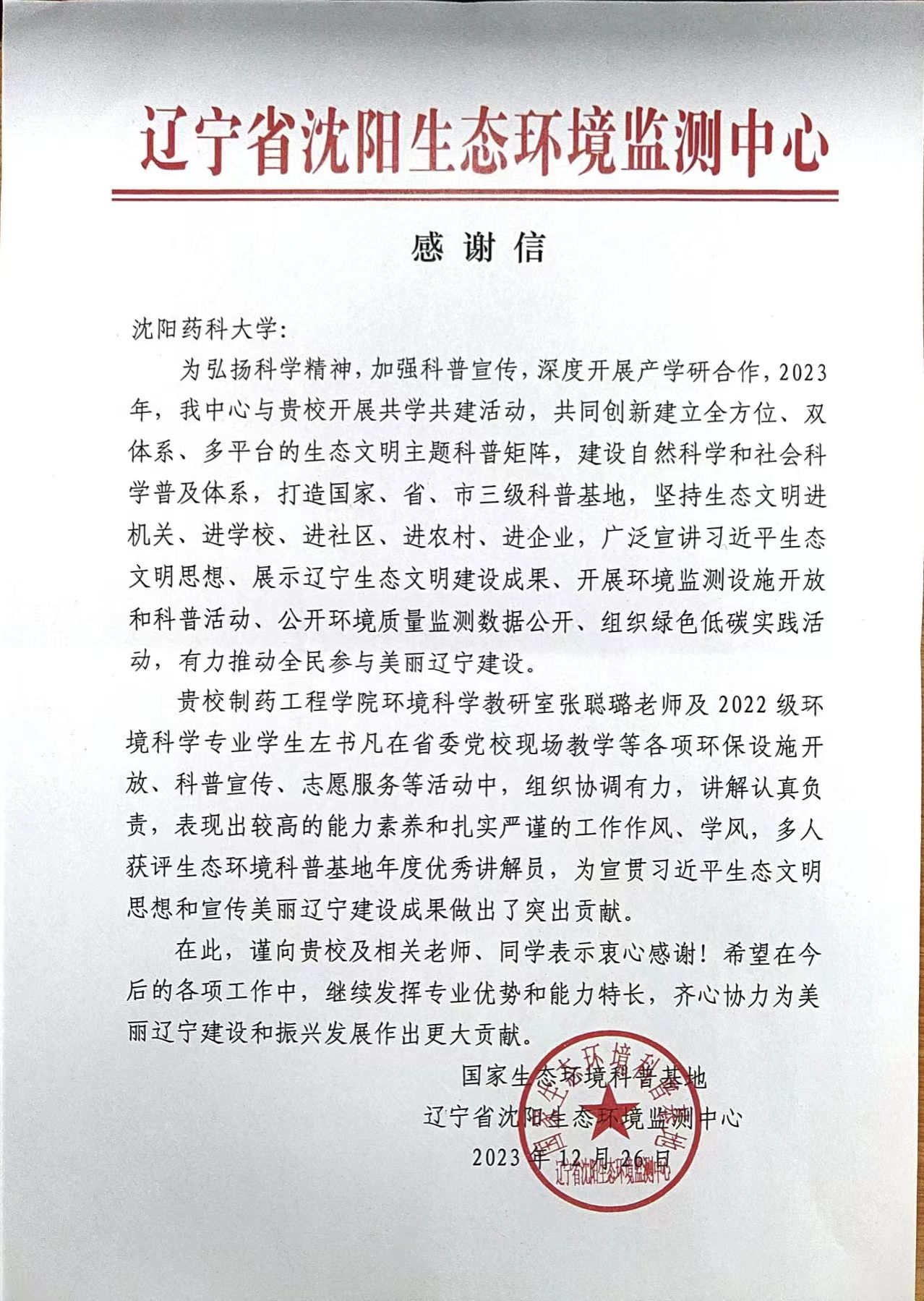 近日,BV伟德官方网站收到一封来自辽宁省沈阳生态环境监测中心的感谢信。信中对伟德官网环境科学教研室张聪璐老师及2021级环境科学专业学生左书凡,在省委党校现场教学等各项环保设施开放、科普宣传、志愿服务等活动中的能力素养、工作作风和学风给予高度肯定和赞扬,对伟德官网志愿者表示了由衷的感谢和诚挚的敬意。