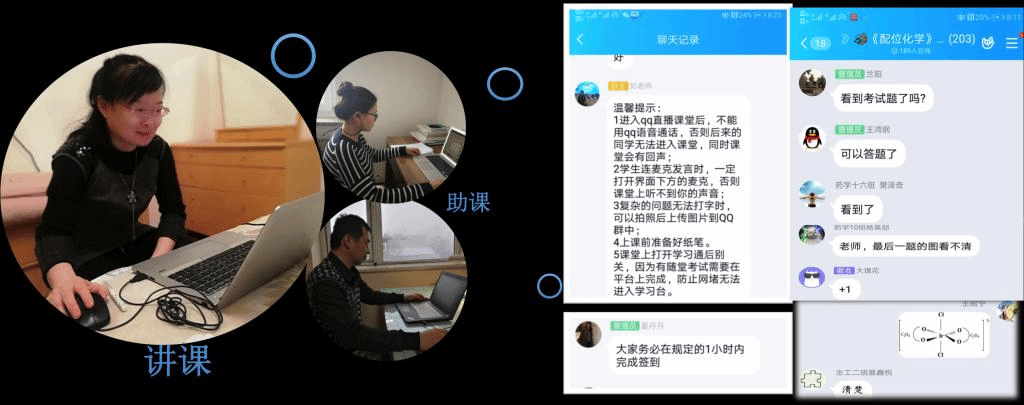 在短短两周时间里,王绍宁教授带领刘迎春、王鸿钢、兰阳和夏丹丹四名教师组成2019级全校自由选修《配位化学》的课程团队,召开音频会议,建立总分总的任务分派模式,经过多次模拟试课,迅捷确定教学平台和授课方式,采用QQ直播课堂师生互动为主、超星平台录课视频帮助学生预习为辅,两者相结合方式实施教学,快速建设起了属于沈药自己的《配位化学》课程。