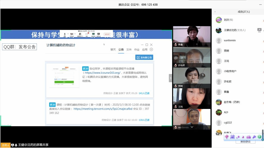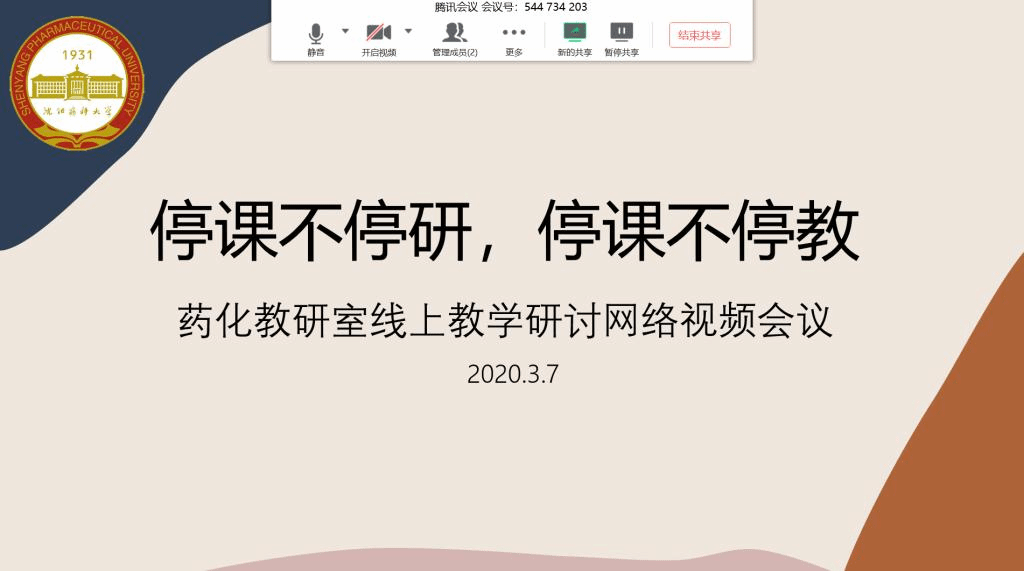 在新冠肺炎疫情防控工作的关键时期,BV伟德官方网站药物化学教研室积极响应教育部和校党委关于“停课不停教,停课不停学”的号召,于3月7日上午应用腾讯会议平台,召开网络视频工作会议,切实落实学校关于“扎实做好线上教学工作”的总体要求,研讨本科生理论课程网络教学的相关要点。会议由教研室主任刘丹教授主持,教研室26位一线教师全部出席会议。