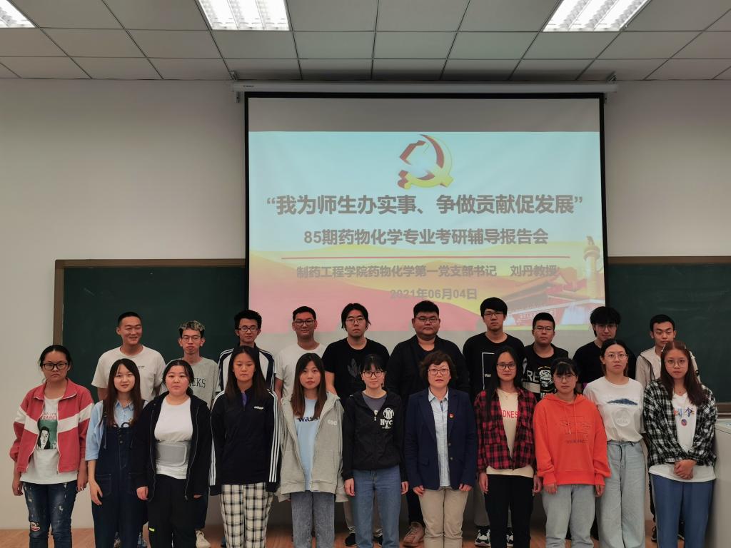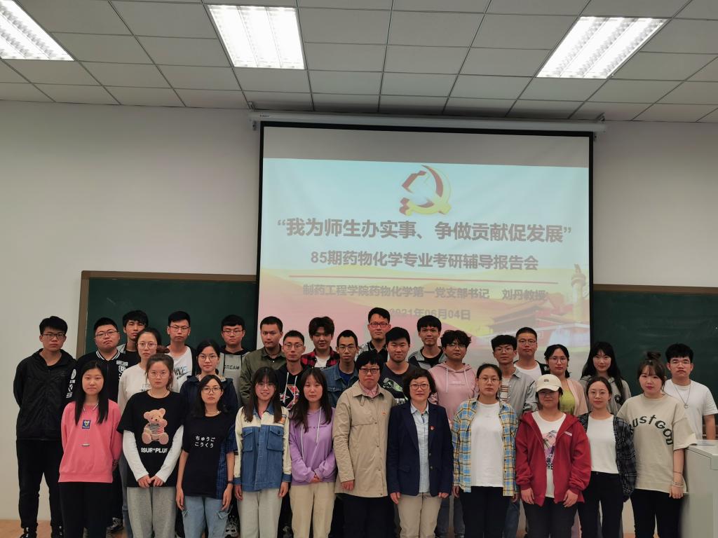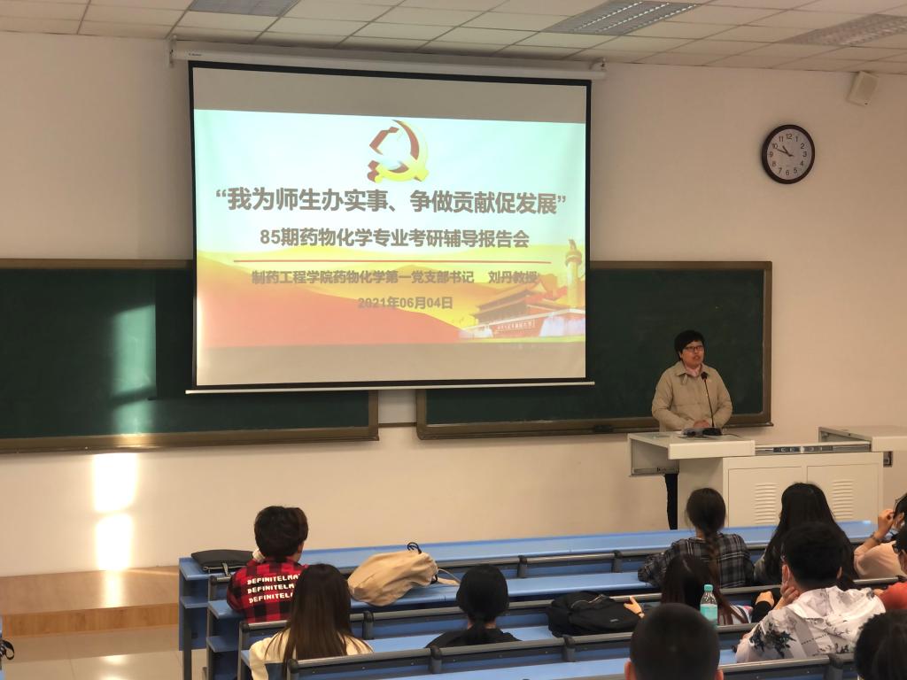 为更好地促进党史学习教育走深走实,充分发挥BV伟德官方网站药物化学第一党支部辽宁省高校“双带头人”教师党支部书记工作室的示范作用,将“我为师生办实事 争做贡献促发展”落到实处,6月4日晚,在第四教学楼204教室,药化第一党支部书记刘丹教授为85期药物化学专业学生做考研辅导报告,药化一班、药化二班共55名有意向参加考研的同学参与了此次考研指导会。院党委书记李哲出席并主持报告会。