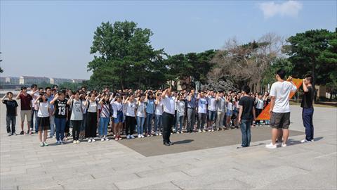 抗美援朝烈士陵园苍松肃立,翠柏静哀。进入烈士陵园后,全体党员随队共同瞻仰了特级战斗英雄黄继光、杨根思、一级战斗英雄邱少云、孙占元、杨连第及各级英雄模范的志愿军等123名烈士的灵位;继而,来到抗美援朝烈士英名墙下,英名墙上实际镌刻着在抗美援朝战争中牺牲的174407个烈士英名(现确认抗美援朝烈士197653位,其中23246位无名烈士)。每名党员长久驻足于烈士英名墙之下,久久凝望着烈士英名;拾级而上,共同仰望着迎面矗立的一座23米高花岗岩砌成的四棱锥形纪念碑,碑体正面是董必武同志亲笔题字“抗美援朝烈士英灵永垂不朽”。
